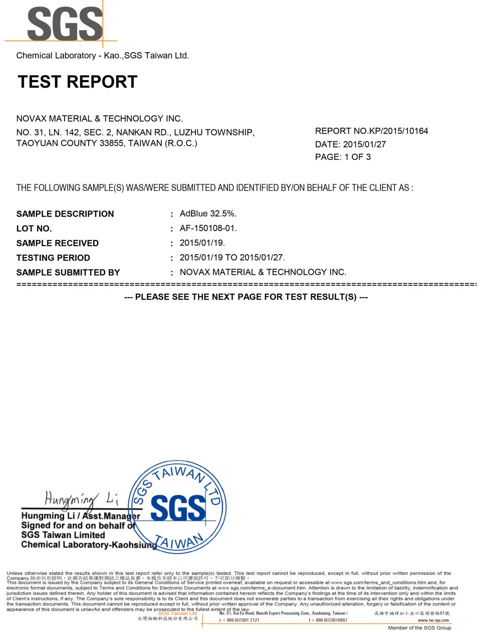 [SGS 品質檢驗] - 諾瓦車用尿素溶液品質檢測報告