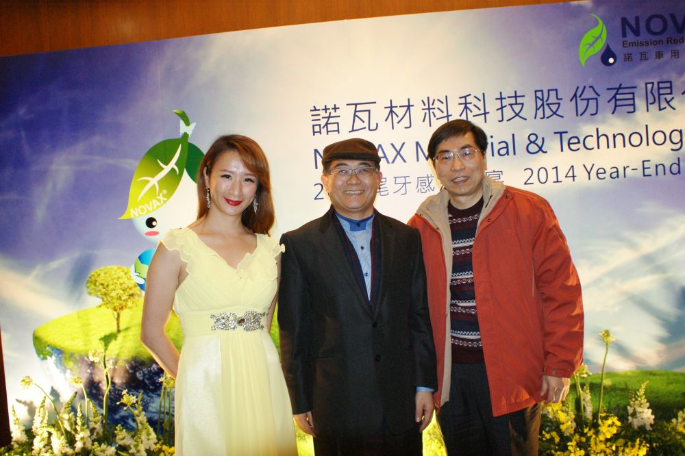 諾瓦董事長楊聯智(中)與尾牙主持人(左)及兆豐國際商業銀行 鄭余生經理(右)合照