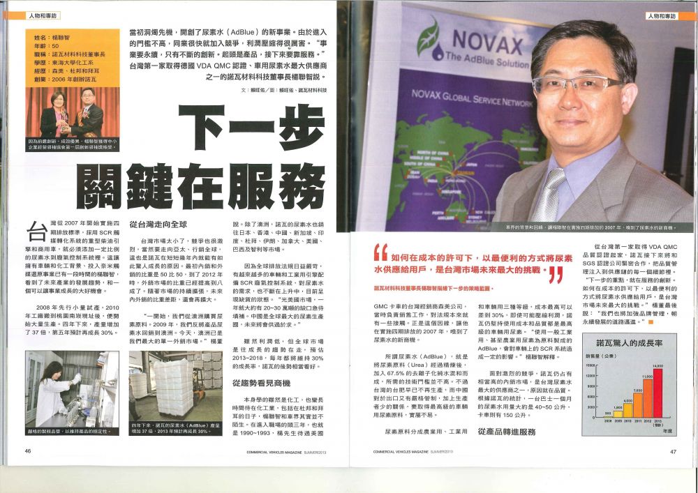 2013年一開始即接獲商用車雜誌的邀訪,這代表著市場對諾瓦的肯定。在2013年台灣邁入5期環保法規的同時,也代表著台灣AdBlue市場的擴大,未來將有更多的客戶使用AdBlue。所以商用車雜誌本期對我司的介紹,不僅是教育消費者,也傳遞新的消費訊息給廣大讀者。我司秉持一貫創新服務的精神,相信在楊聯智總經理的代領下,將踏出更大的事業版圖。