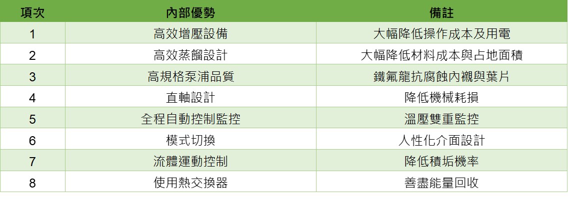跟過去的蒸餾器比較,諾瓦MVR蒸發器(機械式蒸汽再壓縮技術mechanical vapor recompression )已不像以往大型蒸餾塔一樣,需占地非常多的面積,消耗非常多的能源,透過不斷的測試與研究,諾瓦MVR蒸發器有效改善過往蒸餾塔之缺點,下列為之諾瓦MVR蒸發器內部構造分析表,透過分析表可以清楚知道我們諾瓦MVR蒸發器,在結構設計上非常注重節能,零組件品質也是層層把關,充分表現出我們諾瓦在水處理設備的投入的研究並展現對廢水零排放政策的決心及優勢