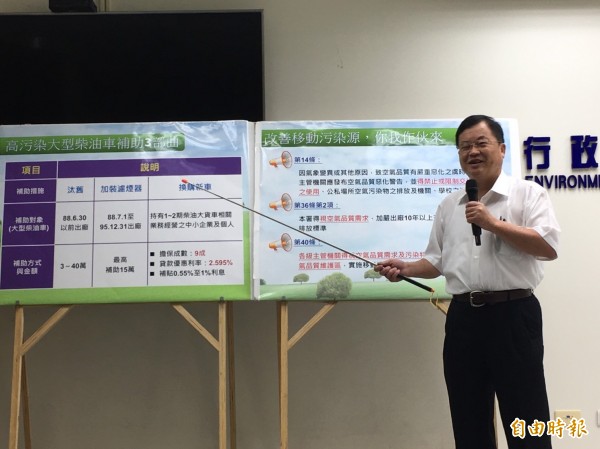 環保署去年起辦理1至2期大型柴油車報廢(依車重補助5至40萬元、平均每輛20萬元);3期大型柴油車加裝濾煙器(每套最高補助15萬元);汰舊換新1至2期大型柴油車者,定期減徵大貨車新車貨物稅5萬元。今年環保署再出招,協調金融金購推出優惠利率